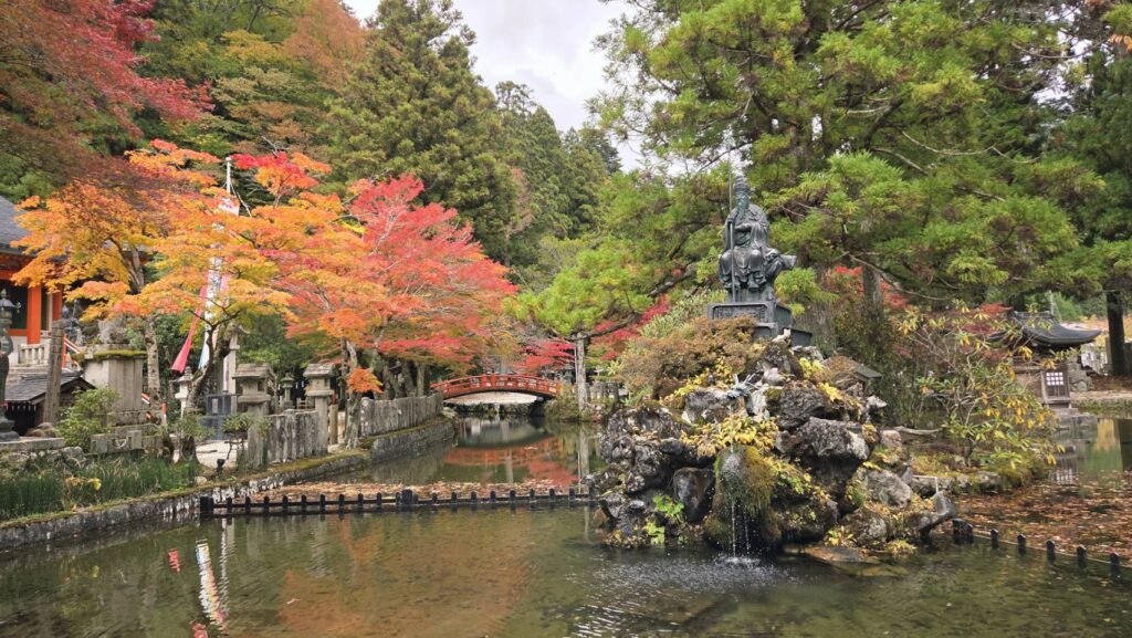 龍泉寺境内の木々は、現在「緑」「黄色〜オレンジ」「真っ赤」「散り始め」のさまざまな段階にあります。まさに“グラデーション紅葉”が楽しめる状態です。