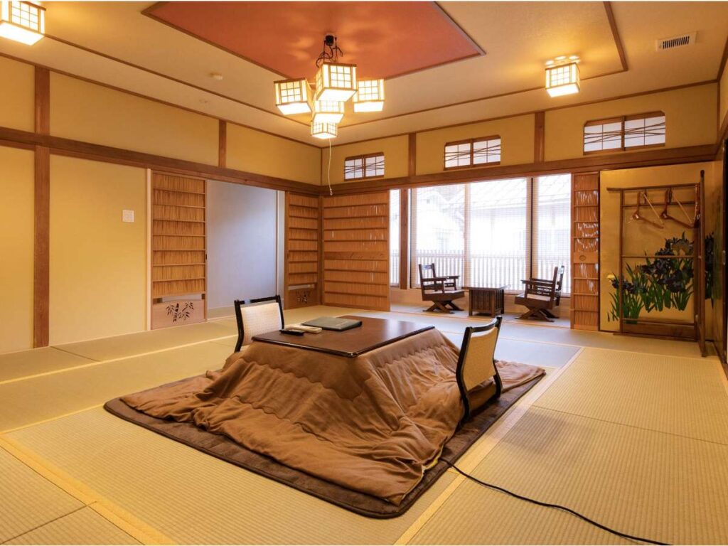 角甚では、皆さまにより快適にお過ごしいただけるよう各お部屋にコタツを設置いたしました。もちろんエアコンも完備していますが、足元からじんわり温まるコタツでの団らんは、冬ならではの贅沢。