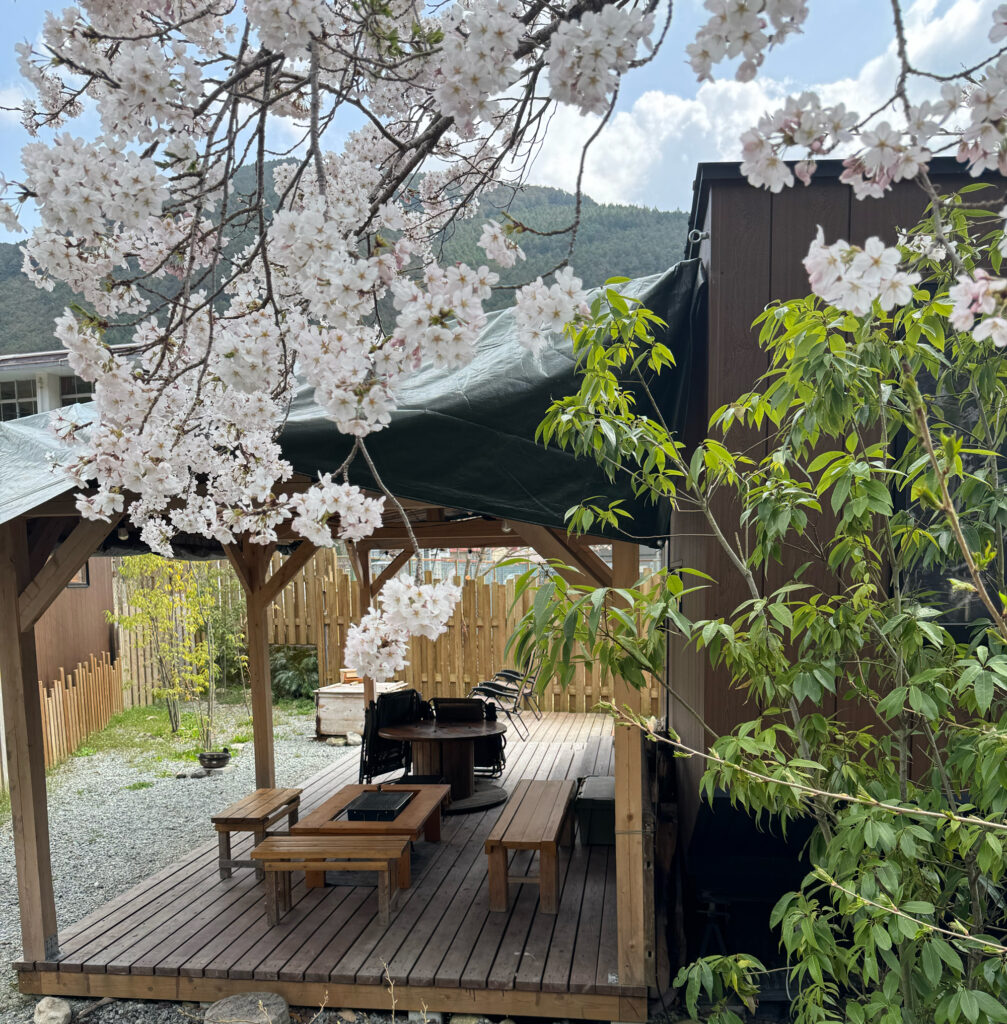 Camp Base Kadojinでは、桜の下で過ごすグランピング体験をお楽しみいただけます。